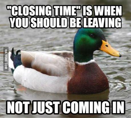 |  Traduction pour ceux qui ne parlent pas anglais: "L'heure de fermeture" est quand on quitte la pharmacie, pas quand on y rentre. |