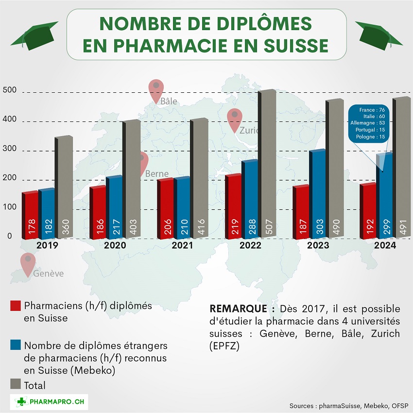 En Suisse, le diplôme de pharmacien est, comme celui de médecin, décerné par la Confédération suisse. Une fois le diplôme obtenu, la Confédération enregistre et trace tous ces professionnels de la santé, sur le Registre des Professions Médicales (Medregom). Elle leur remet un numéro d’identification, le GLN (Global Location Number, plus d'infos sur le site Refdata), qui correspond au numéro d’identification personnel de tout professionnel de la santé ayant obtenu son diplôme. Lorsqu’un diplôme étranger est reconnu par la Confédération, son détenteur est également inscrit sur Medregom et recevra un GLN.