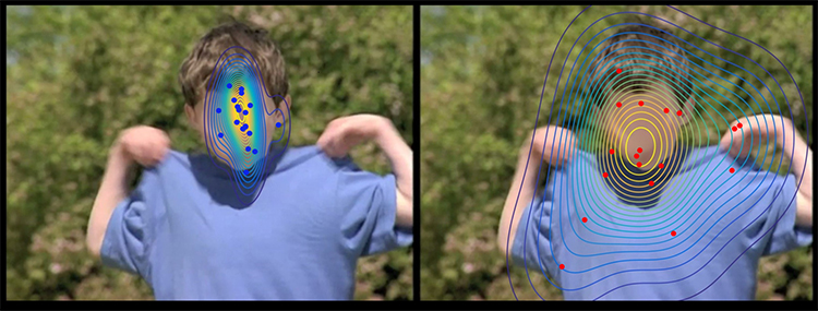 Chaque point indique la position exacte du regard d’un enfant pendant la projection du film. A gauche, les points bleus appartiennent aux enfants avec un développement typique, les points rouges, à droite, aux enfants atteints de troubles du spectre de l’autisme (TSA). Le visage projeté n’était pas flouté pendant l’expérience.