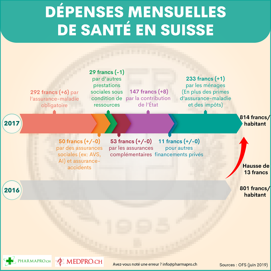 En 2017, les dépenses mensuelles de santé ont atteint 814 francs par habitant, soit 13 francs de plus que l’année précédente. Elles ont été couvertes à raison de 292 francs (+6) par l’assurance-maladie obligatoire, de 50 francs (+/-0) par des assurances sociales telles que l'AVS, l’AI et l’assurance-accidents, de 29 francs (-1) par d'autres prestations sociales sous condition de ressources et de 53 francs (+/-0) par les assurances complémentaires. L'État y a contribué pour 147 francs (+8) et d’autres financements privés pour 11 francs (+/-0). En plus des primes d'assurance-maladie et des impôts, les ménages ont dû débourser directement le solde, soit 233 francs (+1). Ce montant comprend en particulier le financement des prestations des établissements médico-sociaux, des traitements dentaires ainsi que la franchise et la participation aux frais prévues par l’assurance-maladie pour les traitements hospitaliers et ambulatoires.