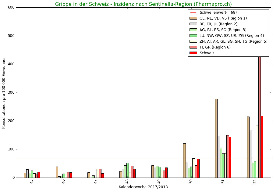Die Sentinella-Grippe-Überwachung unterteilt die Schweiz in 6 geographische Regionen: 1 (GE/NE/VD/VS), 2 (BE/FR/JU). 3 (AG, BL, BS, SO)\, 4 (LU, NW, OW, SZ, UR, ZG), 5 (AI, AR, GL, SG, SH, TG, ZH) und 6 (GR, TI). Die am meisten betroffene Region mit 527 Fällen ist die Region Süden.