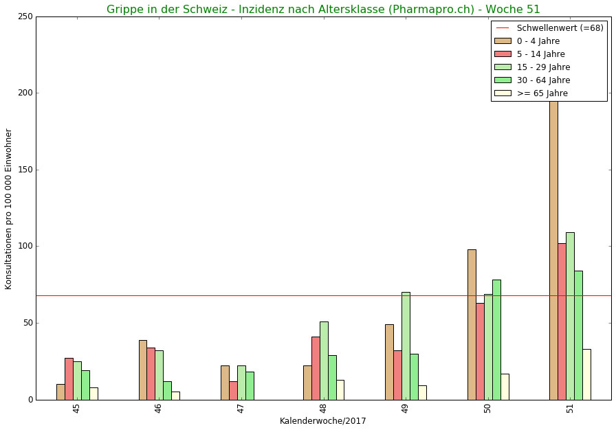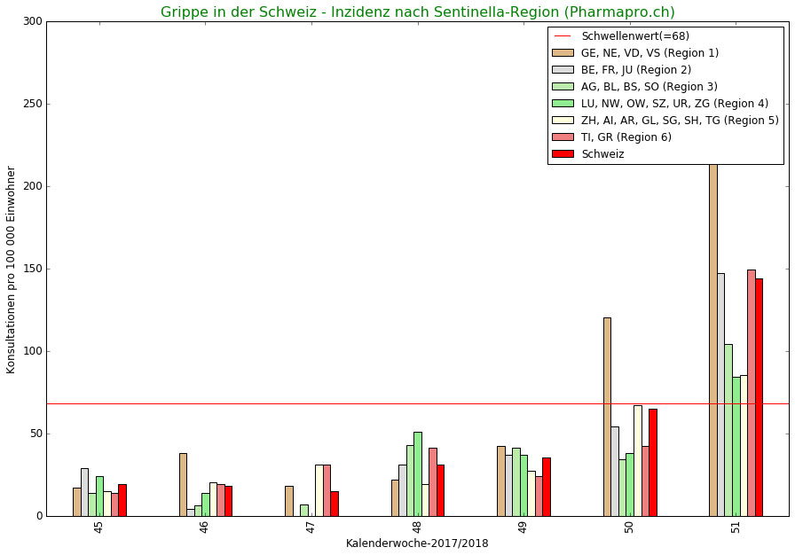 Im Vergleich mit der vergangenen Woche, in der 65 Fälle auftraten, ist die Anzahl der Grippepatienten deutlich gestiegen. In der Schweiz richtet sich der epidemiologische Grenzwert der Grippe nach 68 Influenzavirus-Verdachtsfällen pro 100'000 Einwohner und Saison 2017/2018. Diese Ergebnisse aus 144 Arztterminen pro 100'000 Einwohner innerhalb der 51en Kalenderwoche 2017 stammen von der Sentinella-Grippe-Überwachung.