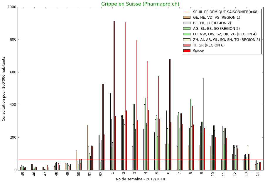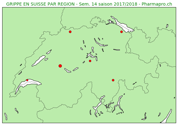 L'observatoire de la grippe Sentinelles distingue 6 régions géographiques en Suisse. Les régions 1 (GE/NE/VD/VS) et 2 (BE/FR/JU) concernent les cantons romands. Actuellement, plus aucune région de Suisse romande n'est touchée par l'épidémie de grippe. La région 1, c'est-à-dire les cantons de Genève, Neuchâtel, Vaud et Valais, recense 35 examens médicaux pour 100'000 habitants, soit moins que la moyenne nationale. La région la plus touchée avec 59 cas est la région 2, soit les cantons de Berne, Fribourg et Jura. Mais comme on peut le constater, même la région la plus touchée de Suisse se situe en dessous du seuil épidémiologique.