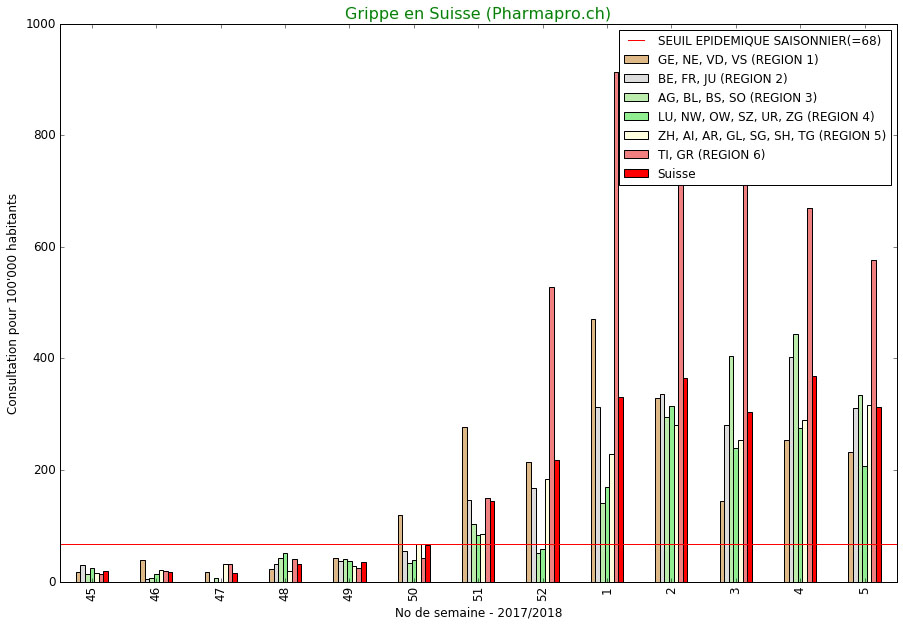 L'observatoire de la grippe Sentinelles distingue 6 régions géographiques en Suisse. Les régions 1 (GE/NE/VD/VS) et 2 (BE/FR/JU) concernent les cantons romands. Actuellement, les deux régions de Suisse romande sont touchées par l'épidémie de grippe. La région 1, c'est-à-dire les cantons de Genève, Neuchâtel, Vaud et Valais, recense 233 examens médicaux pour 100'000 habitants, soit moins que la moyenne nationale. La région la plus touchée avec 576 cas est la région sud.