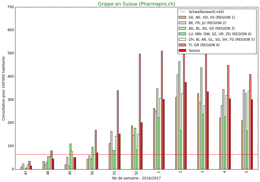 En Suisse le seuil épidémiologique de la grippe se situe à 64 cas de suspicions du virus influenza pour 100'000 habitants pour la saison 2016/2017.