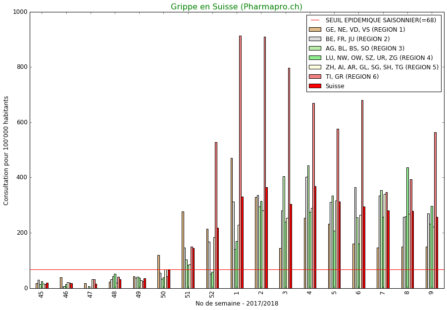 L'observatoire de la grippe Sentinelles distingue 6 régions géographiques en Suisse. Les régions 1 (GE/NE/VD/VS) et 2 (BE/FR/JU) concernent les cantons romands. Actuellement, les deux régions de Suisse romande sont touchées par l'épidémie de grippe. La région 1, c'est-à-dire les cantons de Genève, Neuchâtel, Vaud et Valais, recense 149 examens médicaux pour 100'000 habitants, soit moins que la moyenne nationale. La région la plus touchée avec 563 cas est la région sud.