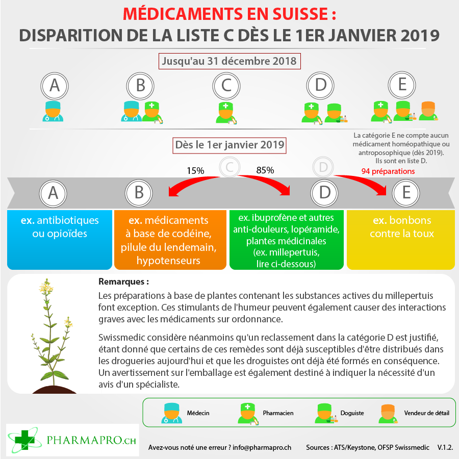 Une autre conséquence de la révision de la loi est l'abolition de l'ancienne catégorie ou liste C, qui nécessitait l'avis du personnel médical. Swissmedic avait déjà annoncé en novembre dernier que quelque 550 médicaments seraient déclassés de C à D. Ils seront bientôt également disponibles en droguerie (voir infographie ci-dessous). Les autres médicaments du groupe C ont été ajoutés à la catégorie B, qui n'est disponible qu'en pharmacie ou directement auprès des médecins prescripteurs (seulement en Suisse allemande).