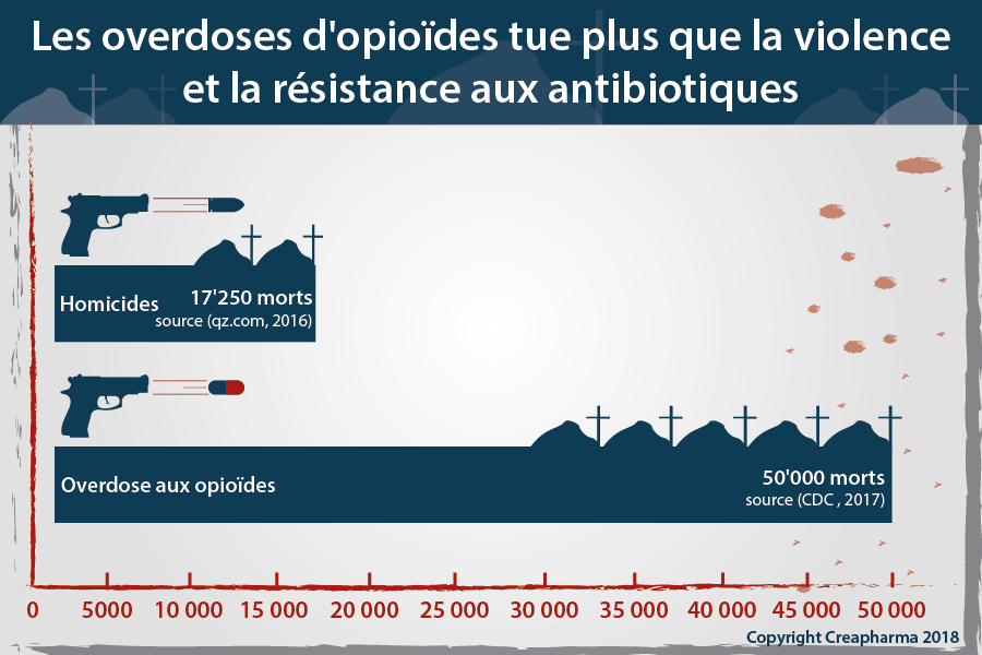 Chaque année aux Etats-Unis presque 50’000 personnes meurent d’overdose aux opiacés (opioïdes, en anglais opioid), comme le rappelle un article de l’hebdomadaire de référence The Economist en février 2019. En 2017, il y a eu 47’600 morts provoqué par une overdose d’opiacé aux Etats-Unis, 5 fois plus qu’en l’an 2000. Comme on le voit sous l’infographie ci-dessous, cela représente plus de morts que le nombre d’homicides. L’ensemble des décès provoqués par tous les médicaments, incluant les opiacés, est estimé aux Etats-Unis à 70’000 par an, soit plus que le nombre de soldats américains tués pendant toute la guerre du Vietnam (58’000), comme le relève The Economist. Les opiacés sont des substances utilisées en général contre la douleur. Elles provoquent un sentiment d’euphorie et d’anesthésie. Le Fentanyl, un opiacé de synthèse bon marché, est responsable de nombreux cas d’addictions et de décès par overdose. Avec plus de 15 morts par overdose de médicaments pour 100’000 habitants par année aux Etats-Unis, le seuil épidémique est dépassé (il est en général fixé par l’OMS à 10 pour 100’000 habitants). Une origine possible de cette épidémie, souvent avancée par les journalistes et spécialistes, est un certain laxisme des autorités sanitaires américaines comme la FDA dans l’autorisation de mise sur le marché des opiacés. Un autre facteur est l’influence de l’industrie pharmaceutique qui s’est montrée très agressive notamment au début des années 2000 en ciblant notamment de nombreux médecins, par exemple de famille. Les opiacés ont souvent été prescrits à des personnes qui auraient pu être traitées avec des antalgiques classiques comme le paracétamol ou les corticoïdes. Pendant l’année 2012, le nombre de prescriptions d’opiacés aux Etats-Unis s’est élevé à 255 million, selon The Economist.