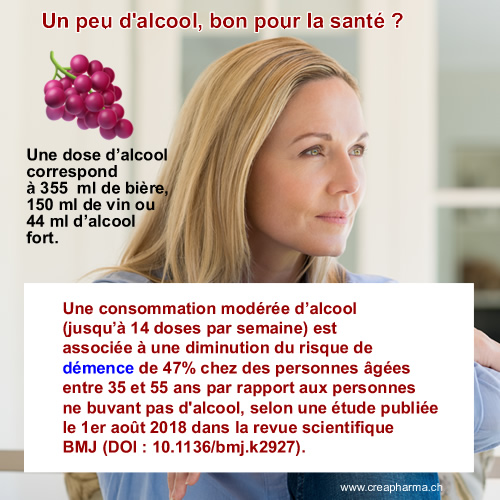 Une consommation modérée d’alcool (jusqu’à 14 doses par semaine) est associée à une diminution du risque de démence de 47% chez des personnes âgées entre 35 et 55 ans par rapport aux personnes ne buvant pas d’alcool, selon une étude publiée le 1er août 2018 dans la revue scientifique BMJ (DOI : 10.1136/bmj.k2927). Pour arriver à ces conclusions les chercheurs ont observé les habitudes de plus de 9000 personnes. Une hypothèse sur l’effet positif de l’alcool pourrait être associée à une diminution de la formation de plaques bêta-amyloïde dans le cerveau. Une dose d’alcool correspond à 14 g d’alcool pur ou 355 ml de bière, 150 ml de vin ou 44 ml d’alcool fort. L’étude a montré que les personnes buvant plus de 14 doses d’alcool par semaine voyaient leur risque de démence augmenter, de 17% pour chaque 7 doses supplémentaire d’alcool. Les auteurs précisent toutefois que cette étude ne devrait pas encourager les personnes à boire plus d’alcool. L’alcool provoque directement chaque année plus de 3 millions de morts dans le monde, par des accidents de voiture ou des maladies comme le cancer ou la cirrhose.