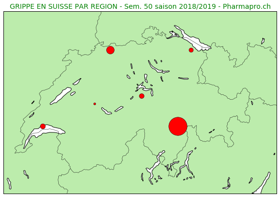 L'observatoire de la grippe Sentinelles distingue 6 régions géographiques en Suisse. Les régions 1 (GE/NE/VD/VS) et 2 (BE/FR/JU) concernent les cantons romands. Actuellement, aucune région de Suisse romande n'est touchée par l'épidémie de grippe. La région 1, c'est-à-dire les cantons de Genève, Neuchâtel, Vaud et Valais, recense 21 examens médicaux pour 100'000 habitants, soit moins que la moyenne nationale.  La région la plus touchée avec 75 cas est la région sud (Tessin notamment).