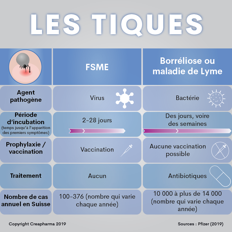 L'OFSP recense également le nombre de consultations médicales à la suite d'une piqûre de tique et le nombre de cas de borréliose, aussi appelée maladie de Lyme. De janvier à fin août, l'OFSP estime à 21'800 le nombre de visites chez le médecin pour une morsure de tique et à 12'600 celui de cas aigus de la maladie de Lyme. Les formes chroniques de borréliose sont déclarées mais pas comprises dans le rapport.